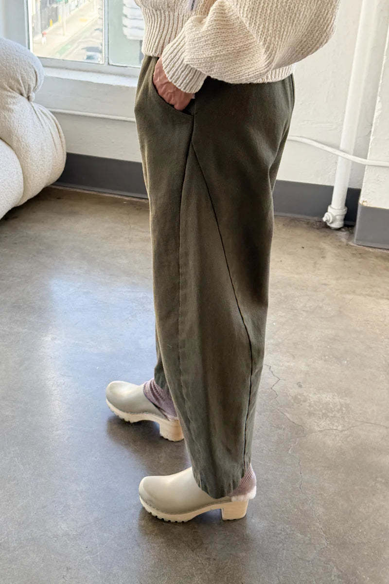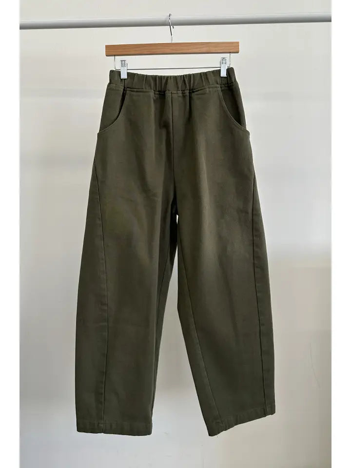 These are the pants we love to live in! She has thoughtful design details like an elastic high waist that gives you a room to breath, slightly curved leg shape, cropped length to show off your favorite socks and shoes, unique side panels and deep pockets. The heavy-weight canvas material likely adds durability and gives them a structured look. The Arc pants would make a great addition to everyone's wardrobe and complement to all the Le Bon Shoppe pieces you own!