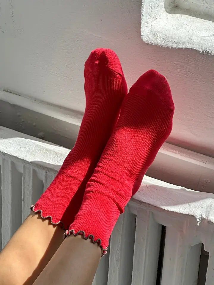 Noble x Le Bon Shoppe — A sock born from our shared love of slow fashion, good design, and color combos that go with literally everything. The Ruffled Modal Socks feature a baby rib texture with a playful lettuce-edge ruffle at the top. Their versatile crew length makes them perfect worn long or scrunched down.