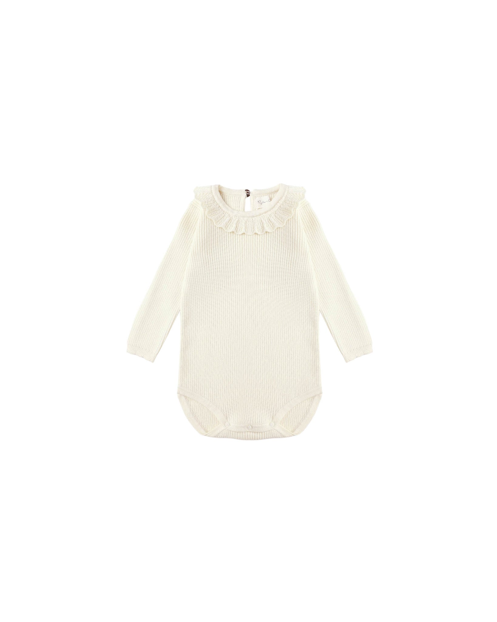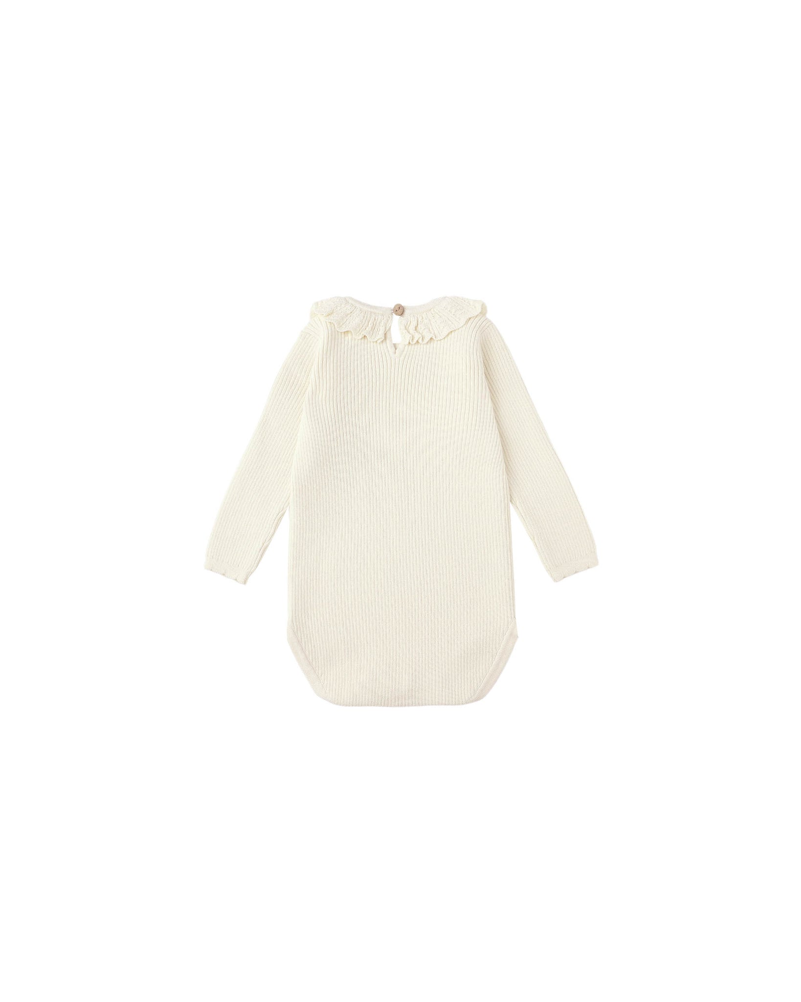 An essential for your little one, this darling knit bodysuit features a sweet ruffle collar, back keyhole button closure, and bottom snaps for effortless changes. Perfect for layering all season long.