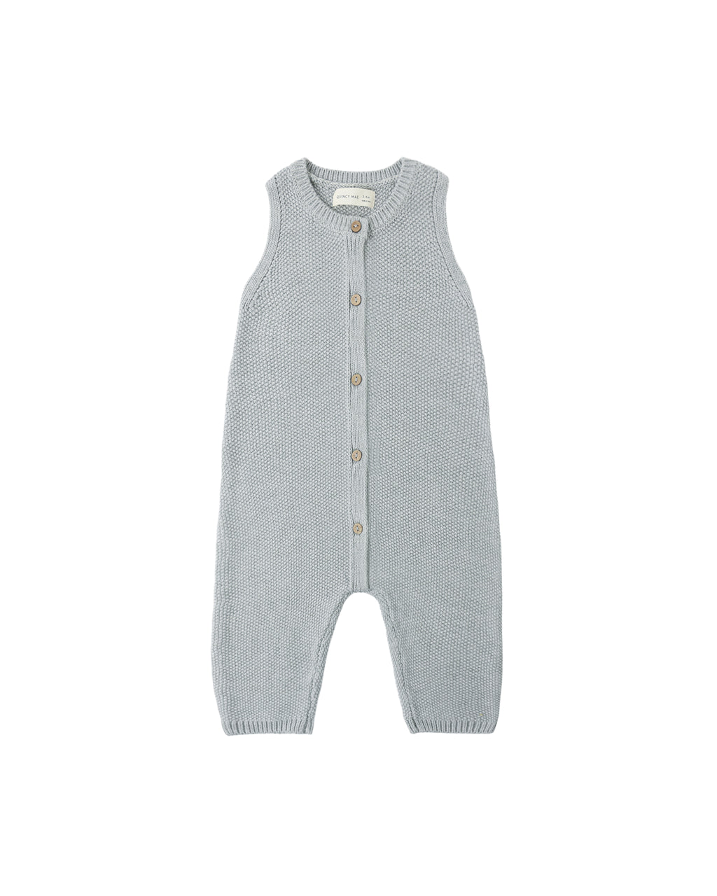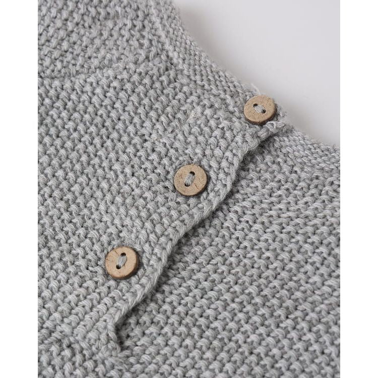 This knitted sleeveless jumpsuit is perfect for your little ones' transitional wardrobe. Designed with coconut buttons down the front for easy changing.