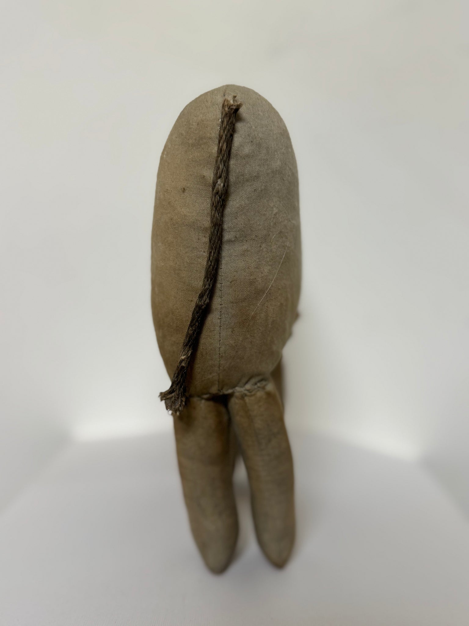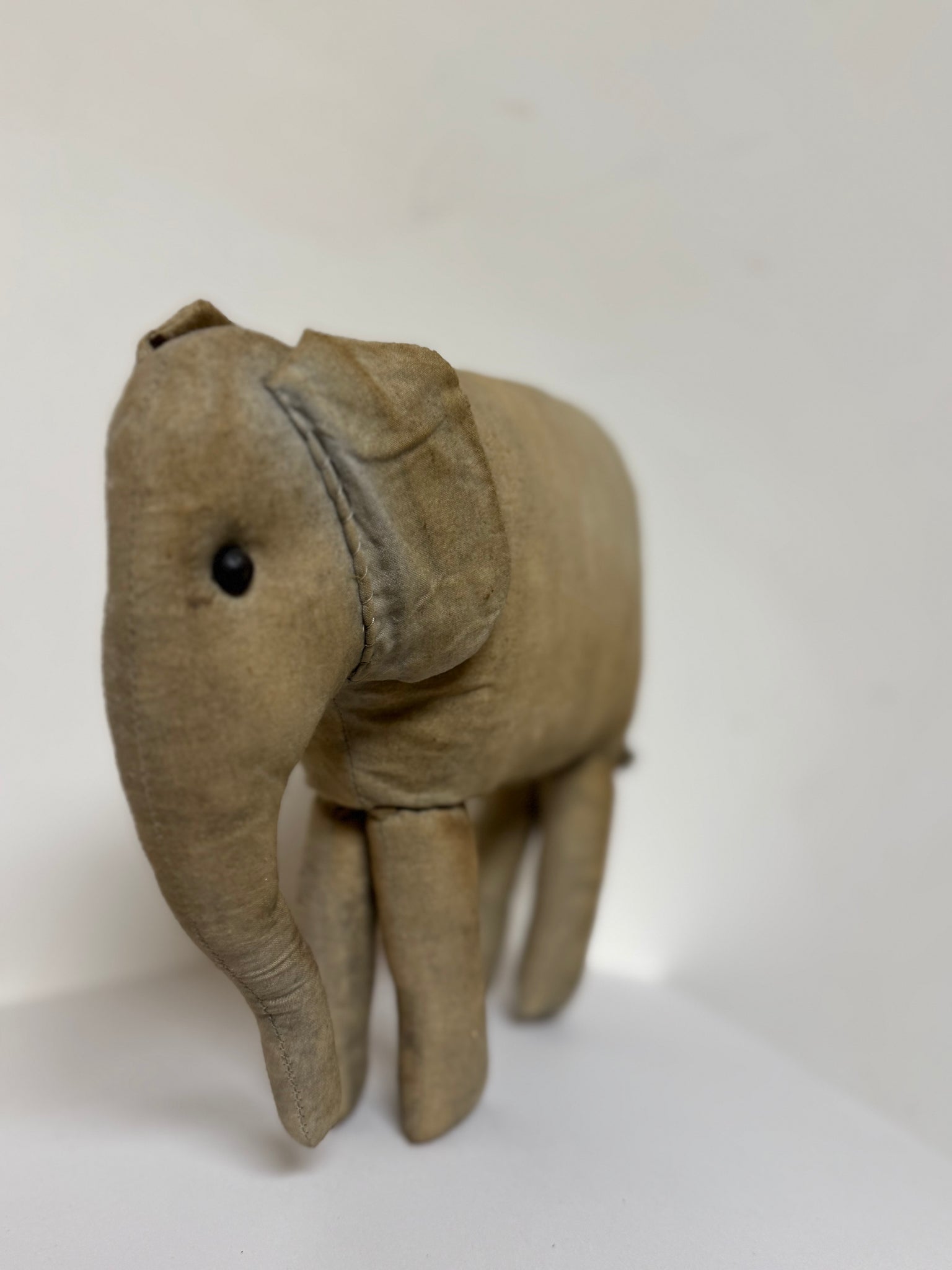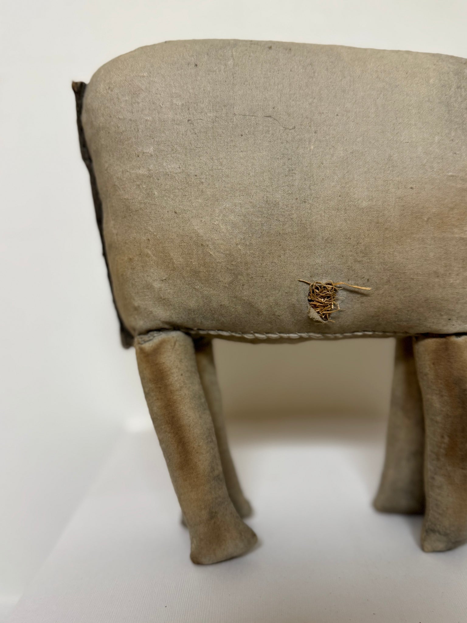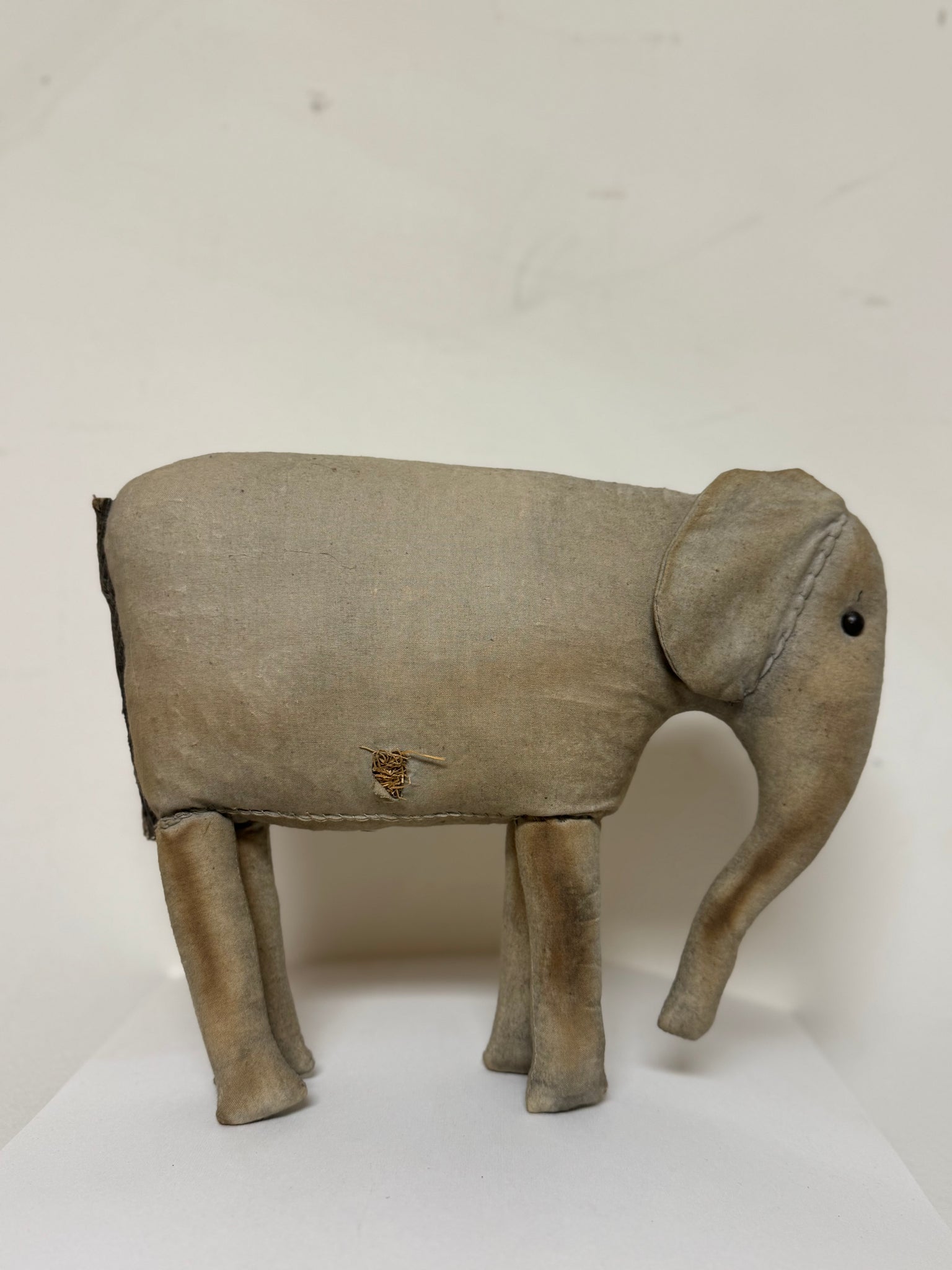 Primitive handmade elephant. This sweet guy is stuffed with straw and carefully hand stitched together from his legs to his ears. There is a small hole on one side  (See pic) but gives him some character. Light gray color. Made of cotton material with aging around the ears and legs. Button bead eyes and a waxed wick tail. Very charming and would look adorable in a baby's nursery or put on display in your home.