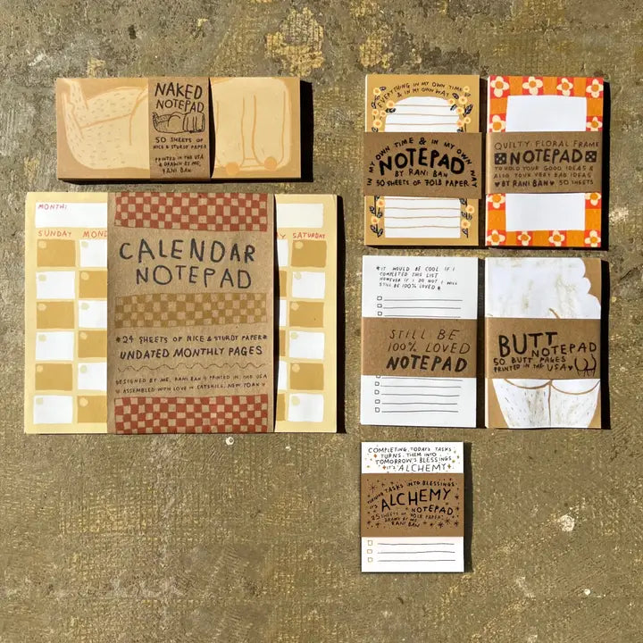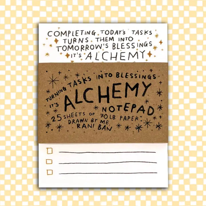 Turn your to-dos into ta-das✨ This very cute and sturdy notepad is shipped plastic-free with a hand-lettered eco-wrap. 70LB Paper. 3.5X4.5" notepad with 25 sheets of printed 70 lb paper & a cardboard back. Printed in the USA.
